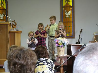 After the program was over, we visited for a few hours........ Toward the end of the time, it was just the S. family, the K. family, and some of the other S. family and us there, and while my dad visited with the guys and Mother visited with the ladies and the boys played with the other boys, I "Babysat" the younger S. children--playing with balloons; "Hide and Seeking"; and visiting the donkey, goat and goose that are in a pen behind the church.